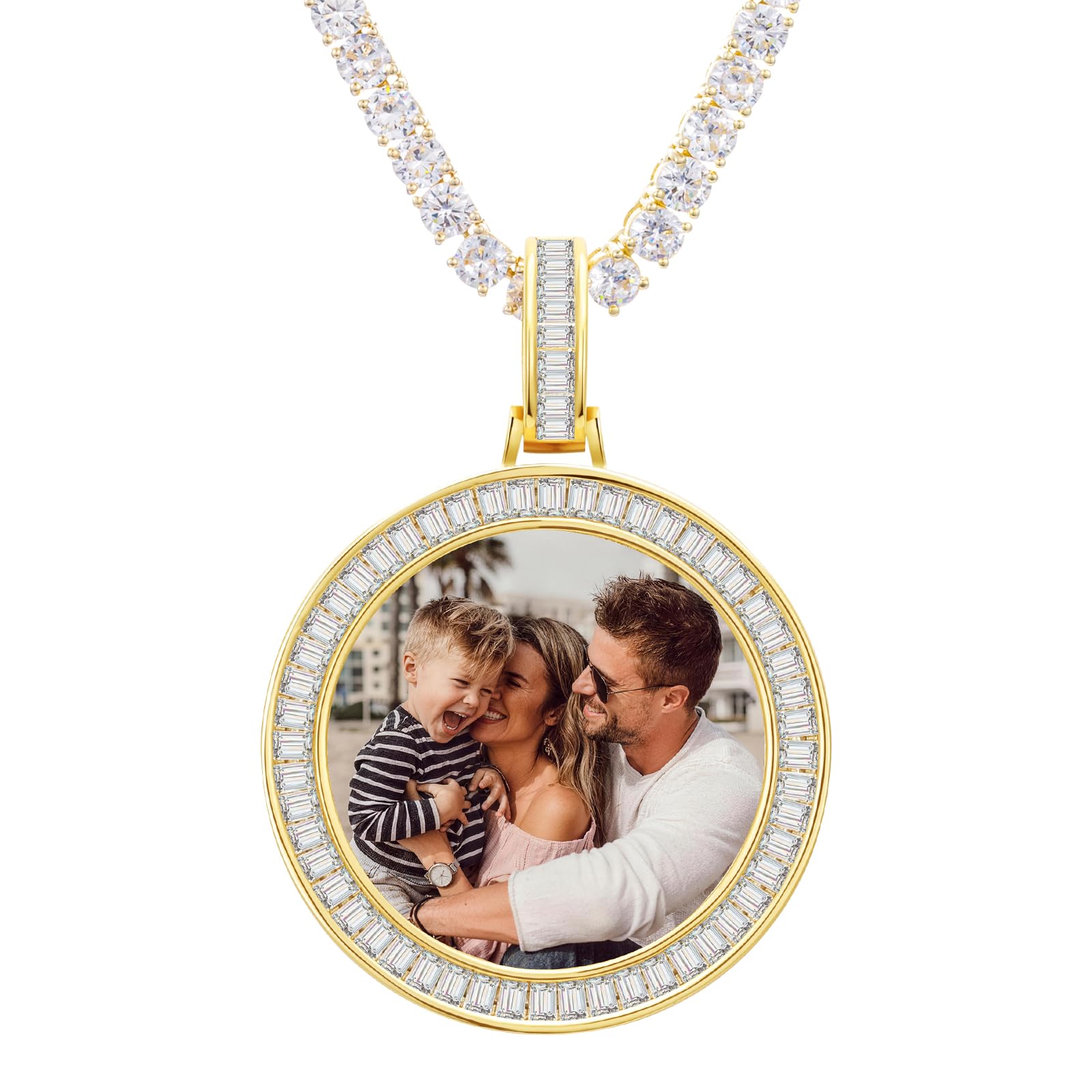 - Memory Necklace Photos Material - The medal pendant with photo is made with AAA zircon+brass pendant and stainless steel chain, which are durable and sturdy to wear long time. Non-allergy, non-tarnish, high resistance to rust, corrosion and tarnishing. Hip hop picture circle pendant with protective covers on front surface that keep the photo away from moisture and scratch damage never fade.